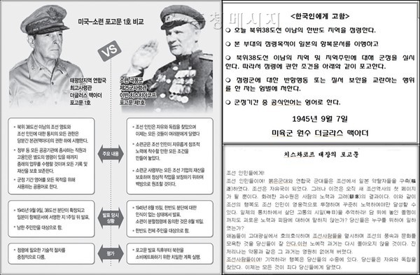 1945년 9월 7일 맥아더는 ‘태평양 방면 미군 육군부대 총사령부 포고 제1호, 조선인민에게 고함’이라는 포고문에서 “나의 지휘하에 있는 승리에 빛나는 군대는 금일 북위 38도 이남의 조선영토를 점령한다(today occupy the territory of Korea south of 38 degrees north latitude).”고 포고했다. 제3조는 “나의 모든 명령과 나의 권한 하에 발한 명령에 복종하여야 한다. 점령부대(occupying forces)에 대한 모든 행위에 대하여는 엄중히 처벌”할 것이라고 했다.