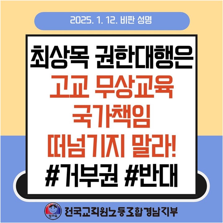 전교조 세종지부가 세종 23개 교육시민사회단체가 연대하고 있는 세종교육연대에서 최상목권한대행의 디지털교과서 보조교재와 고교무상교육 연장법안 거부권 행사 중단을 요구하는 성명서를 냈습니다. ‘최상목 권한대행 거부권 중단요구’ 성명서를 전재합니다. |
