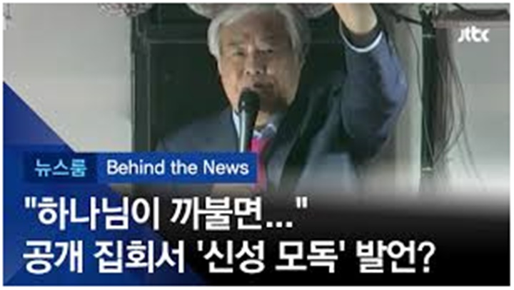 "지금 대한민국은요, 누구 중심으로 돌아가는 것이냐. 전광훈 목사 중심으로 돌아가게 돼 있어. 기분 나빠도 할 수 없다", "앞으로 점점 더합니다. 앞으로 10년 동안의 대한민국은 전광훈, 대한민국은 전광훈 목사 중심으로 돌아가게 돼 있다니까요", "나에게 '기름 부음'이 임했기 때문"이라며 "나는 하나님 보좌(寶座)를 딱 잡고 살아. 하나님 꼼짝마. 하나님 까불면 나한테 죽어. 내가 이렇게 하나님하고 친하단 말이야. 친해“ 지난 2019년 10월 22일 사랑 제일교회 전광훈 목사가 청와대 앞에서 진행한 집회에서 한 말이다.