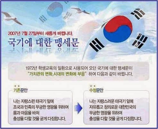 ‘국기에 대한 맹세는 1968년 3월 충청남도 교육위원회가 처음 작성하여 보급하기 시작한 것을 1972년 문교부가 전국적으로 확대 시행하였다. 2007년 5월, 행정자치부는 다시 기존의 맹세문 문안이 가치에 맞지 않는다는 점과 문법에 어긋난 점을 들어 '국기에 대한 맹세' 수정안을 확정하여 2007년 7월 27일 공포, 1982년에는 대통령령으로 오늘날까지 시행되고 있다. 국기에 대한 맹세의 변천사이다.