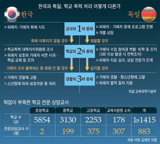 ‘전국 초·중·고교에 교사·학부모·법조인·지역경찰 등으로 구성된 학교폭력대책자치위원회를 구성해 가해·피해 학생 사이의 민형사상 분쟁을 조정하고, 피해 학생에게는 심리치료 등 구제 활동을 하거나, 가해 학생에게는 사회봉사나 퇴학 등의 조처를 취할 수 있도록 하고… 14살 중학교 2학년 학생의 경우, 올해 학폭위에서 징계를 받게 되면 20살까지 학교생활기록부에 기록이 유지되고 사과, 접촉 금지, 학급 교체, 전학, 학교봉사, 사회봉사, 특별교육 이수, 심리치료, 출석 정지, 퇴학(고등학교)이 가능하도록 처벌 수위를 높이고… 우리나라가 학교폭력에 대처하는 방식이다. 이런 처벌위주의 대책도 별 효과를 거두지 못하자 이제 학교 지원금과 교사의 임금을 차등 지급하는 성과급제까지 도입했다. 우리는 왜 독일이 성공한 사례를 벤치마킹하지 못할까?