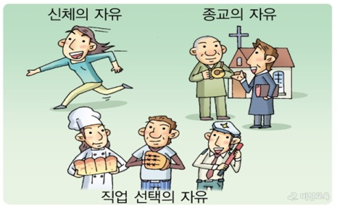 자유권의 내용 - 자유권에는 신체의 자유, 정신적 자유, 사회 · 경제적 자유 등이 있다.