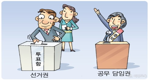 • 참정권의 내용 참정권에는 선거권, 공무 담임권, 국민 투표권 등이 있다.