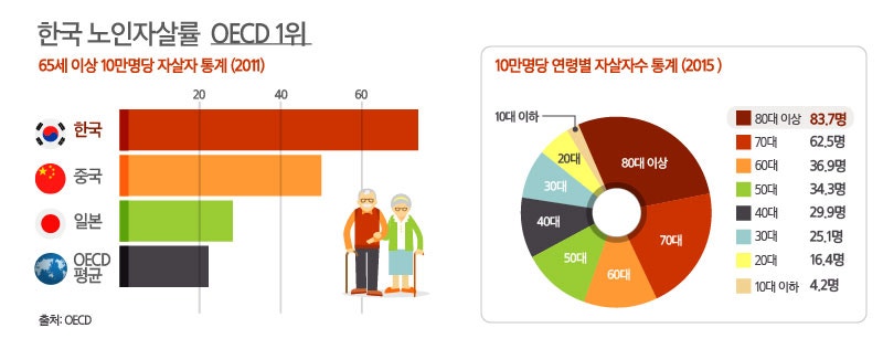 OECD국가 중 노인 자살률 1위. OECD 국가 평균(18.8명)보다 3배 정도 높은 58.6명이나 된다. 그것도 경제적 어려움과 건강 문제 때문이라니… 1인당 국민소득 3만 8천불, 세계 13위(2025년)의 경제 대국인 대한민국에서 노인들이 외로움과 경제적 어려움 때문에 자살을 하다니… ‘모든 국민은 인간으로서의 존엄과 가치를 가지며, 행복을 추구할 권리’를 가진다는데, 그것도 ‘국가가 보장할 의무를 진다’고 했는데… 복지정책의 사각지대에 놓여 사는 노인들은 왜 국가가 보장하는 행복추구권을 누리지 못하고 있을까?