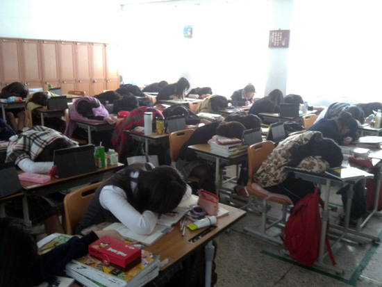 교사들은 말하고 학생들은 얌전히 듣는다.