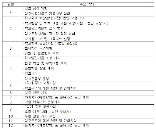 - 학교운영위원회의 회의 소집, 회의록의 작성 및 공개, 의견 수렴, 심의 결과의 시행